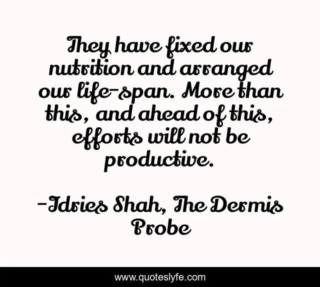 This page presents the quote "They have fixed our nutrition and arranged our life-span. More than this, and ahead of this, efforts will not be productive.". Author of this quote is Idries Shah, The Dermis Probe. This quote is about sufism, evolution, death, sufis, life,.