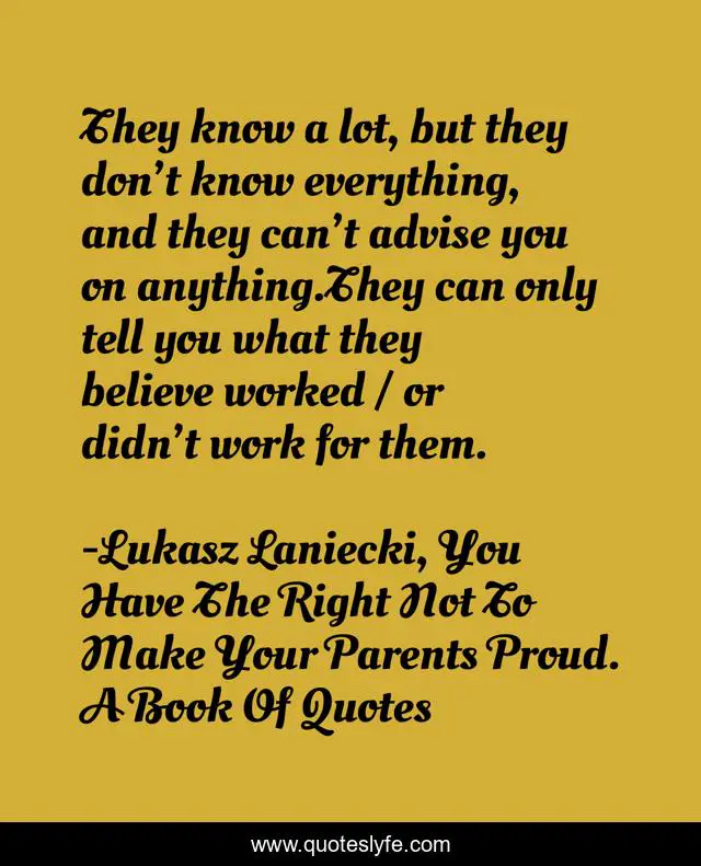 This page presents the quote "They know a lot, but they don’t know everything, and they can’t advise you on anything.They can only tell you what they believe worked / or didn’t work for them.". Author of this quote is Lukasz Laniecki, You Have The Right Not To Make Your Parents Proud. A Book Of Quotes. This quote is about life-choices, ilife, career-choices, family, success, career-paths, parents, life-advice, young-adults,.