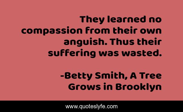 This page presents the quote "They learned no compassion from their own anguish. Thus their suffering was wasted.". Author of this quote is Betty Smith, A Tree Grows in Brooklyn. This quote is about compassion, suffering, anguish,.