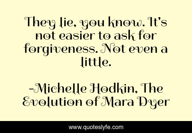 This page presents the quote "They lie, you know. It's not easier to ask for forgiveness. Not even a little.". Author of this quote is Michelle Hodkin, The Evolution of Mara Dyer. This quote is about lie, forgiveness,.