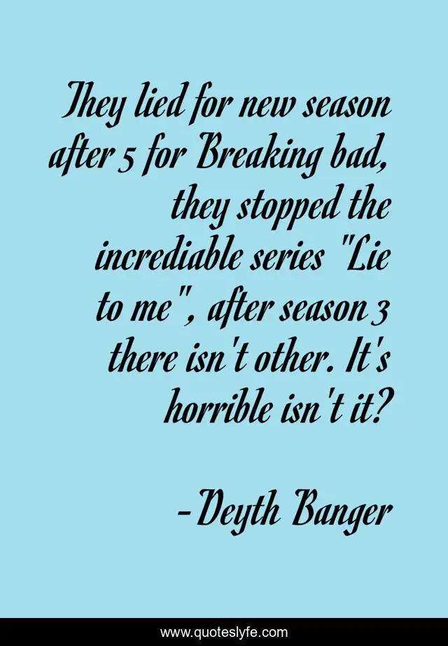 This page presents the quote "They lied for new season after 5 for Breaking bad, they stopped the incrediable series "Lie to me", after season 3 there isn't other. It's horrible isn't it?". Author of this quote is Deyth Banger. This quote is about lie, lied, breaking-bad, after, isn-t-it, new, it, they, series,.