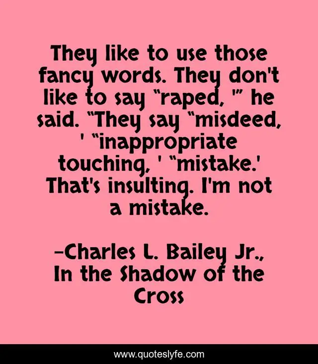 This page presents the quote "They like to use those fancy words. They don't like to say “raped, '” he said. “They say “misdeed, ' “inappropriate touching, ' “mistake.' That's insulting. I'm not a mistake.". Author of this quote is Charles L. Bailey Jr., In the Shadow of the Cross. This quote is about priests, ritualistic-abuse, clergy-abuse, victim, church, rape, catholic, denial, ritual-abuse,.