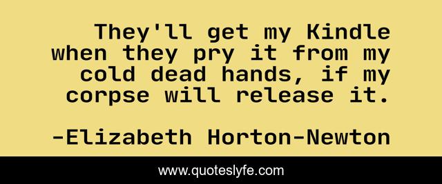 This page presents the quote "They'll get my Kindle when they pry it from my cold dead hands, if my corpse will release it.". Author of this quote is Elizabeth Horton-Newton. This quote is about humorous, kindle, reading,.