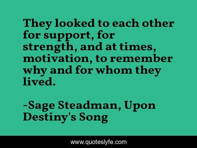 This page presents the quote "They looked to each other for support, for strength, and at times, motivation, to remember why and for whom they lived.". Author of this quote is Sage Steadman, Upon Destiny's Song. This quote is about motivation, death, love, strength-through-adversity, family, life, affection,.