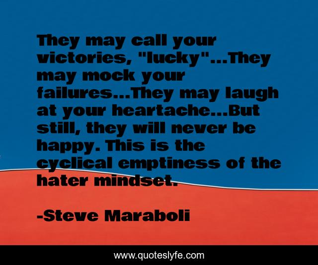 This page presents the quote "They may call your victories, "lucky"...They may mock your failures...They may laugh at your heartache...But still, they will never be happy. This is the cyclical emptiness of the hater mindset.". Author of this quote is Steve Maraboli. This quote is about life, haters, perspective, mindset,.