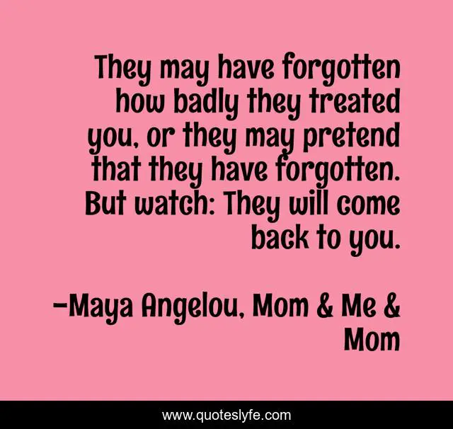 This page presents the quote "They may have forgotten how badly they treated you, or they may pretend that they have forgotten. But watch: They will come back to you.". Author of this quote is Maya Angelou, Mom & Me & Mom. .