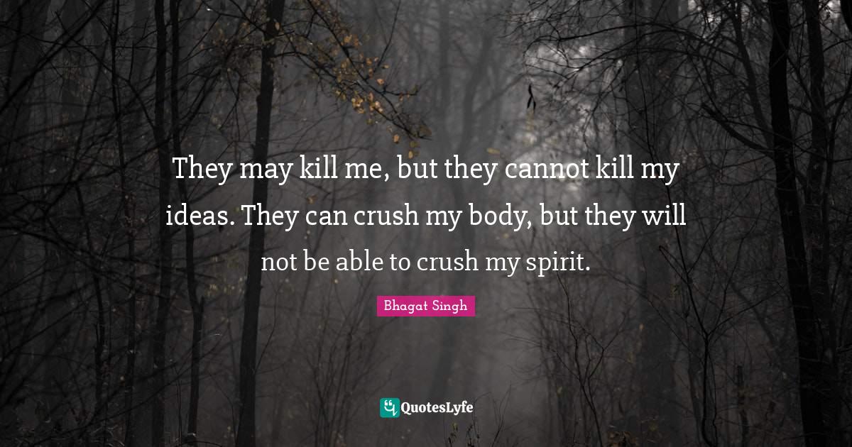 This page presents the quote "They may kill me, but they cannot kill my ideas. They can crush my body, but they will not be able to crush my spirit.". Author of this quote is Bhagat Singh. This quote is about body, may, able, kill me, crush, spirit, ideas,.