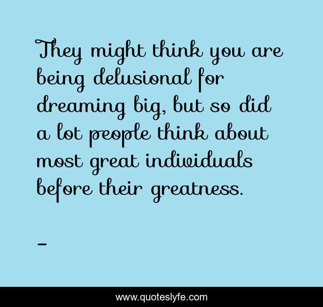 This page presents the quote "They might think you are being delusional for dreaming big, but so did a lot people think about most great individuals before their greatness.". Author of this quote is . This quote is about dream-big, edmond-mbiaka, great-individual, individuals, dreaming-big, greatness,.