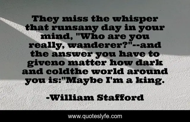 This page presents the quote "They miss the whisper that runsany day in your mind, "Who are you really, wanderer?"--and the answer you have to giveno matter how dark and coldthe world around you is:"Maybe I'm a king.". Author of this quote is William Stafford. This quote is about exile, king, poetry, wanderer,.