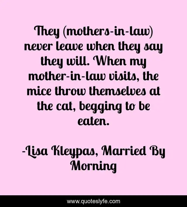 This page presents the quote "They (mothers-in-law) never leave when they say they will. When my mother-in-law visits, the mice throw themselves at the cat, begging to be eaten.". Author of this quote is Lisa Kleypas, Married By Morning. This quote is about fun, lisa-kleypas, historical-romance,.