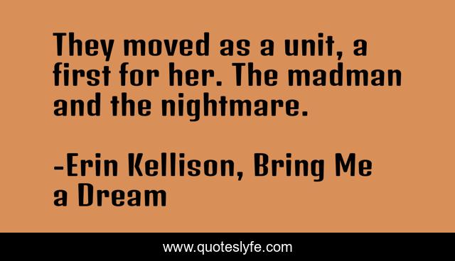 This page presents the quote "They moved as a unit, a first for her. The madman and the nightmare.". Author of this quote is Erin Kellison, Bring Me a Dream. This quote is about urban-fantasy, paranormal,.