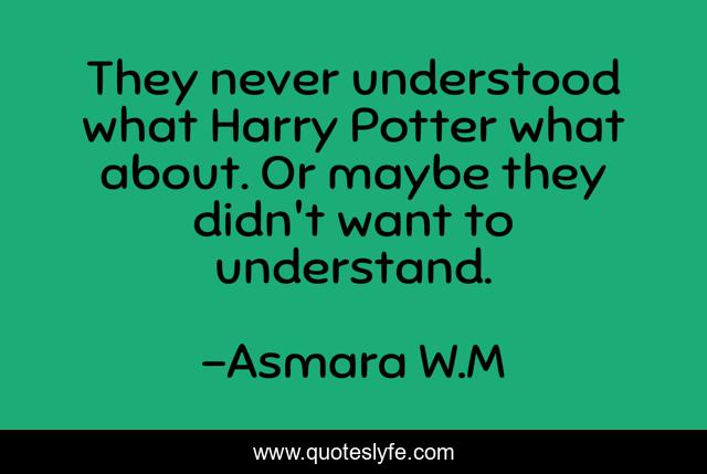 This page presents the quote "They never understood what Harry Potter what about. Or maybe they didn't want to understand.". Author of this quote is Asmara W.M. This quote is about harry-potter, understanding,.