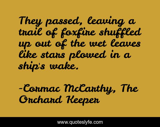 This page presents the quote "They passed, leaving a trail of foxfire shuffled up out of the wet leaves like stars plowed in a ship's wake.". Author of this quote is Cormac McCarthy, The Orchard Keeper. This quote is about simile, literature, descriptive,.