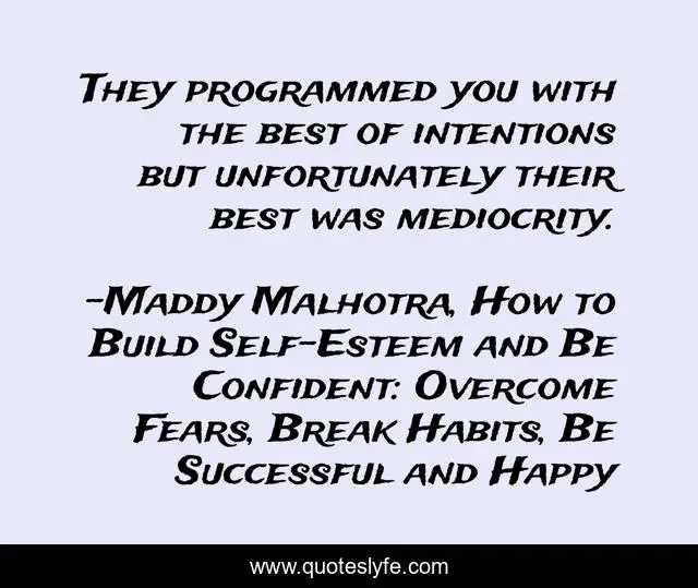 This page presents the quote "They programmed you with the best of intentions but unfortunately their best was mediocrity.". Author of this quote is Maddy Malhotra, How to Build Self-Esteem and Be Confident: Overcome Fears, Break Habits, Be Successful and Happy. This quote is about confidence, parenting-children, beliefs, success, mindset,.