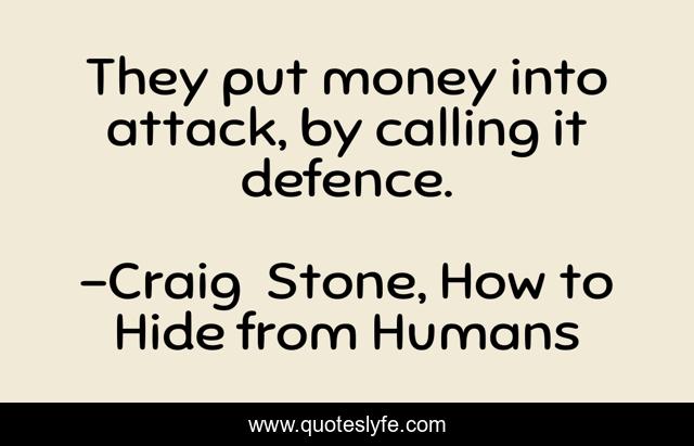 This page presents the quote "They put money into attack, by calling it defence.". Author of this quote is Craig Stone, How to Hide from Humans. This quote is about life, humans, war,.