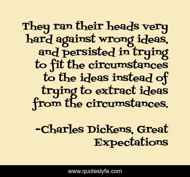 This page presents the quote "They ran their heads very hard against wrong ideas, and persisted in trying to fit the circumstances to the ideas instead of trying to extract ideas from the circumstances.". Author of this quote is Charles Dickens, Great Expectations. This quote is about education, stubbornness, discernment, maturation, discipleship, accommodation,.