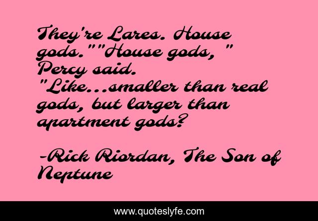 This page presents the quote "They're Lares. House gods.""House gods, " Percy said. "Like...smaller than real gods, but larger than apartment gods?". Author of this quote is Rick Riordan, The Son of Neptune. This quote is about lares, house-gods, apartment-gods, rome, son-of-neptune, mythology, real-gods,.