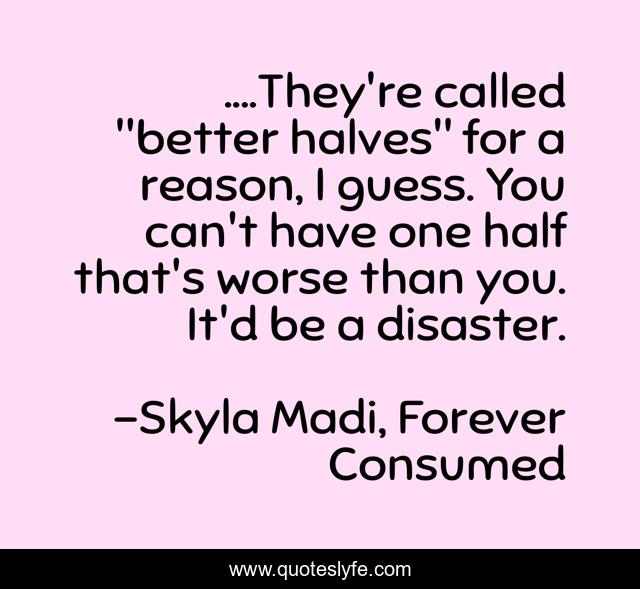 This page presents the quote "....They're called "better halves" for a reason, I guess. You can't have one half that's worse than you. It'd be a disaster.". Author of this quote is Skyla Madi, Forever Consumed. This quote is about new-adult-romance, chick-lit, romance, inspirational, enthusiasm,.