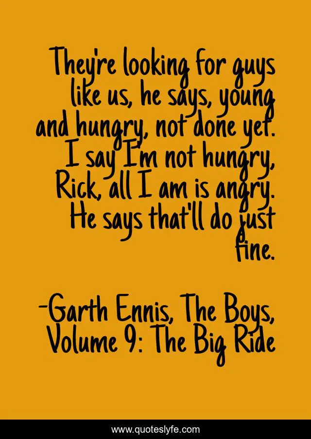 "Garth Ennis, The Boys, Volume 9: The Big Ride Quotes." Quoteslyfe.com, 2025. Fri. 05 Dec. 2025. <https://www.quoteslyfe.com/quote/They-re-looking-for-guys-like-us-184286>.