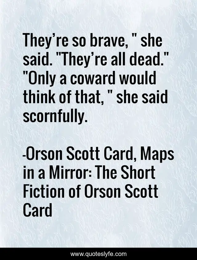This page presents the quote "They’re so brave, " she said. "They’re all dead." "Only a coward would think of that, " she said scornfully.". Author of this quote is Orson Scott Card, Maps in a Mirror: The Short Fiction of Orson Scott Card. This quote is about cowards, the-bully-and-the-beast, heroes, death, bravery,.