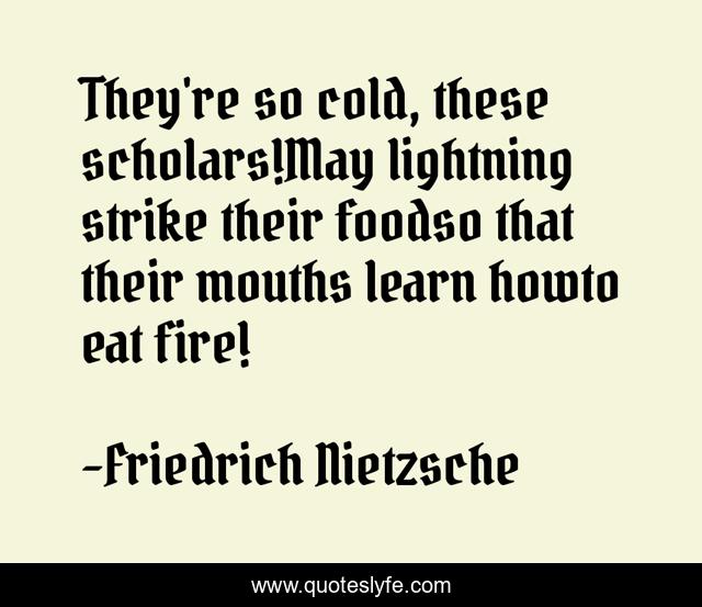 This page presents the quote "They're so cold, these scholars!May lightning strike their foodso that their mouths learn howto eat fire!". Author of this quote is Friedrich Nietzsche. This quote is about higher-education, elitism, coldness, education, scholars, scholarship,.
