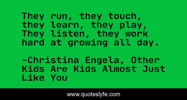 This page presents the quote "They run, they touch, they learn, they play, They listen, they work hard at growing all day.". Author of this quote is Christina Engela, Other Kids Are Kids Almost Just Like You. This quote is about play, run, work-hard, growing, learn, touch, day, listen,.