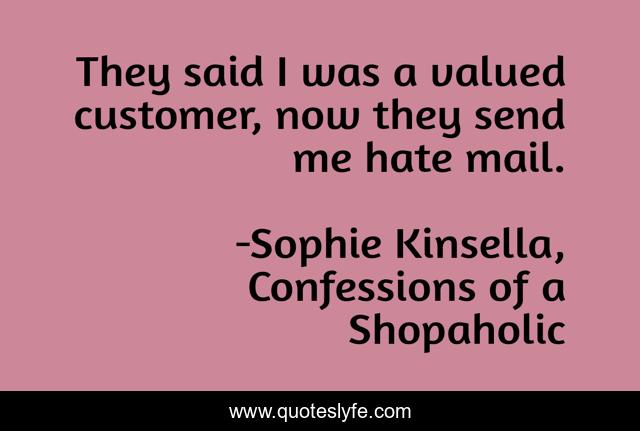 This page presents the quote "They said I was a valued customer, now they send me hate mail.". Author of this quote is Sophie Kinsella, Confessions of a Shopaholic. This quote is about funny, comedy, shopping, humor, humour,.