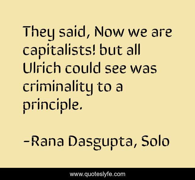 This page presents the quote "They said, Now we are capitalists! but all Ulrich could see was criminality to a principle.". Author of this quote is Rana Dasgupta, Solo. This quote is about modernity, life, corruption-politics, capitalism,.
