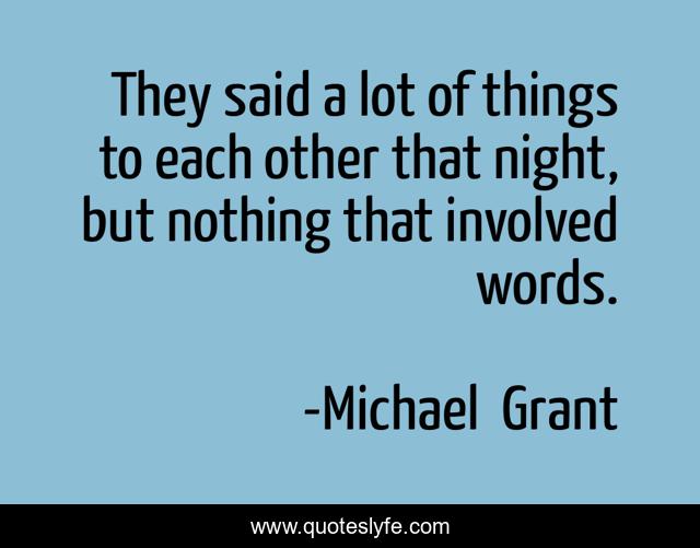 This page presents the quote "They said a lot of things to each other that night, but nothing that involved words.". Author of this quote is Michael Grant. This quote is about love, words, sam, wordless, sleep, kiss, night, astrid, affection,.