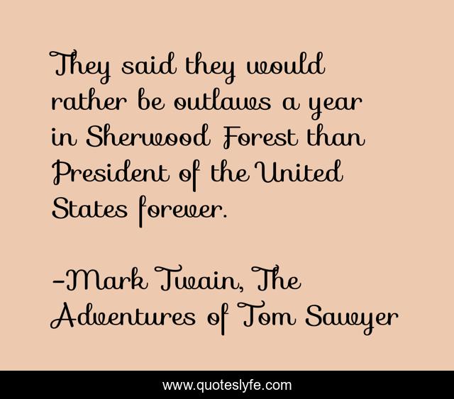 This page presents the quote "They said they would rather be outlaws a year in Sherwood Forest than President of the United States forever.". Author of this quote is Mark Twain, The Adventures of Tom Sawyer. This quote is about imagination, ambition-and-attitude, inspirational, enthusiasm,.
