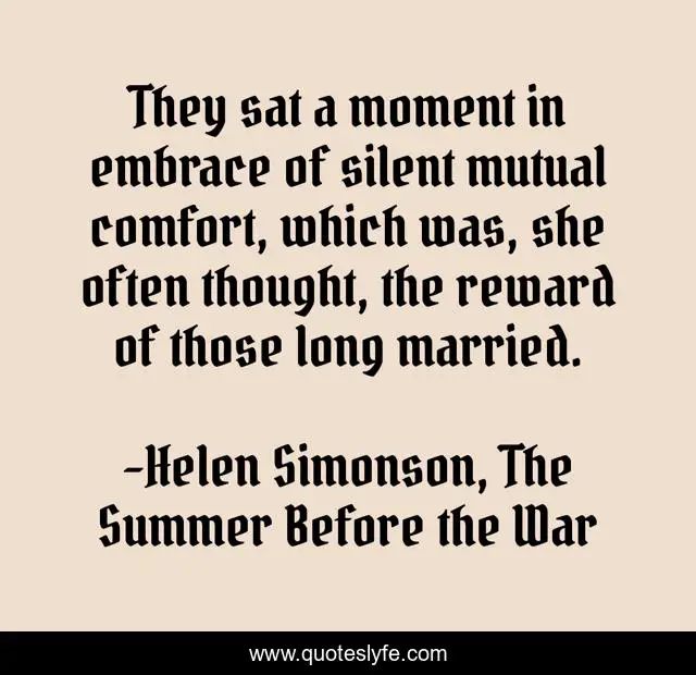 This page presents the quote "They sat a moment in embrace of silent mutual comfort, which was, she often thought, the reward of those long married.". Author of this quote is Helen Simonson, The Summer Before the War. .