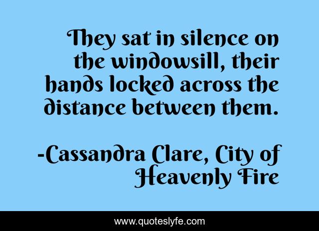This page presents the quote "They sat in silence on the windowsill, their hands locked across the distance between them.". Author of this quote is Cassandra Clare, City of Heavenly Fire. .
