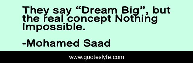 This page presents the quote "They say “Dream Big”, but the real concept Nothing Impossible.". Author of this quote is Mohamed Saad. This quote is about impossible, dream-big, dreaming,.