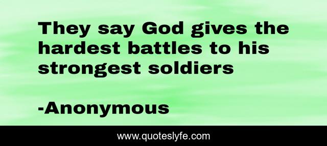 This page presents the quote "They say God gives the hardest battles to his strongest soldiers". Author of this quote is Anonymous. This quote is about god, challenge, soldier,.