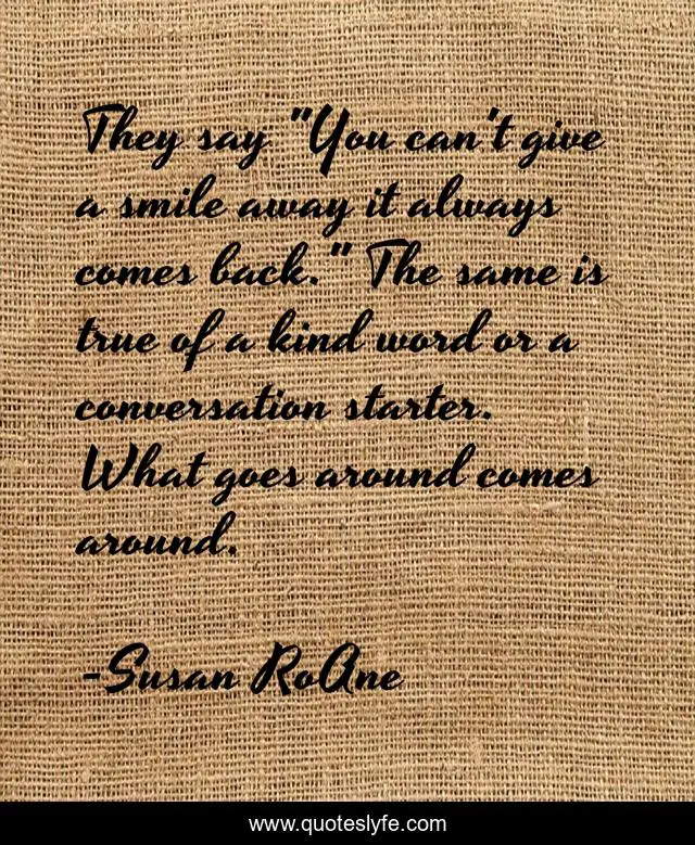 This page presents the quote "They say "You can't give a smile away it always comes back." The same is true of a kind word or a conversation starter. What goes around comes around.". Author of this quote is Susan RoAne. This quote is about positive, confidence,.