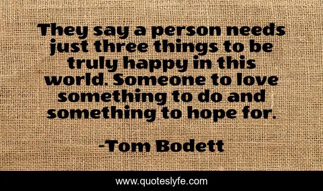 This page presents the quote "They say a person needs just three things to be truly happy in this world. Someone to love something to do and something to hope for.". Author of this quote is Tom Bodett. .