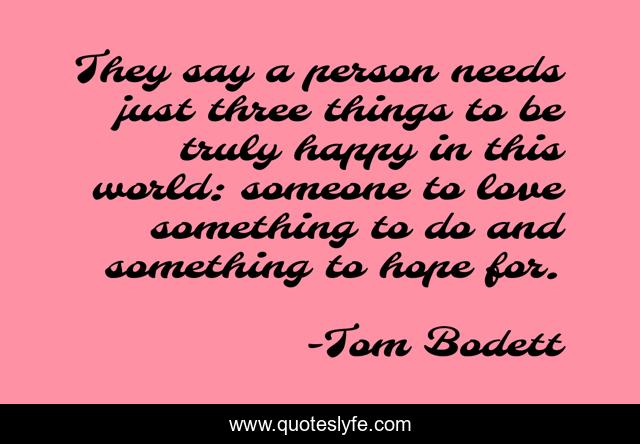 This page presents the quote "They say a person needs just three things to be truly happy in this world: someone to love something to do and something to hope for.". Author of this quote is Tom Bodett. .
