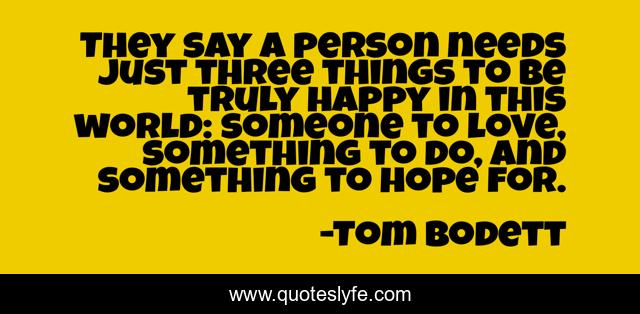 This page presents the quote "They say a person needs just three things to be truly happy in this world: someone to love, something to do, and something to hope for.". Author of this quote is Tom Bodett. This quote is about love, joy, hope, wishing, happiness, affection,.