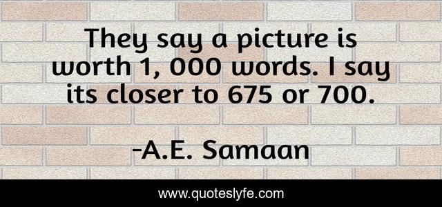 This page presents the quote "They say a picture is worth 1, 000 words. I say its closer to 675 or 700.". Author of this quote is A.E. Samaan. This quote is about photographs, expression-of-true-feelings, photography, creativity, writing, writers, books, expression,.