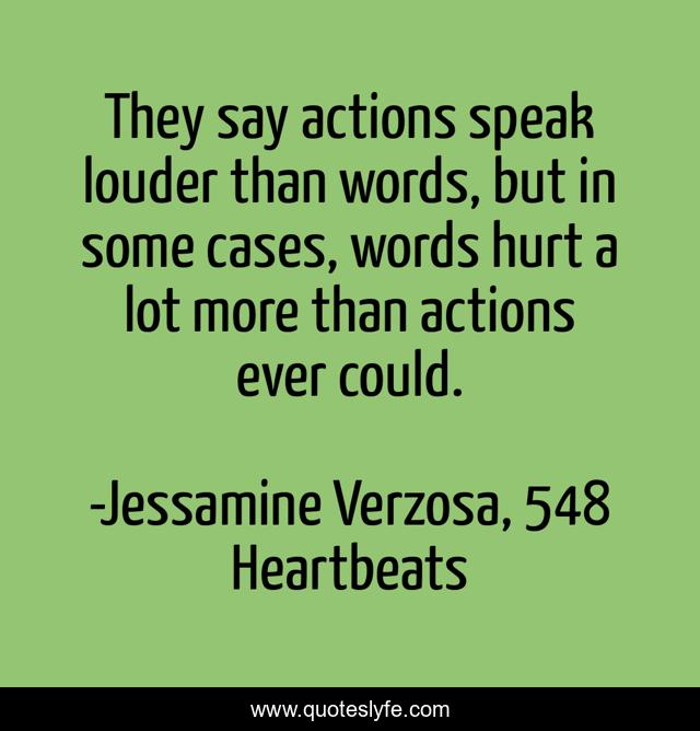 This page presents the quote "They say actions speak louder than words, but in some cases, words hurt a lot more than actions ever could.". Author of this quote is Jessamine Verzosa, 548 Heartbeats. This quote is about romance, actions, love, words, affection,.