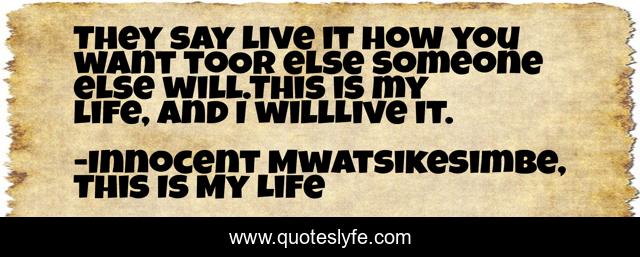 This page presents the quote "They say live it how you want toOr else someone else will.This is my life, and I willLive it.". Author of this quote is Innocent Mwatsikesimbe, This Is My Life. This quote is about life, positive, motivational, confidence, self-improvement, inspirational, enthusiasm, optimistic,.