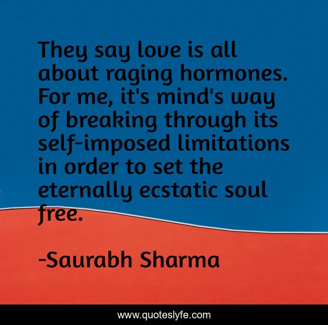 This page presents the quote "They say love is all about raging hormones. For me, it's mind's way of breaking through its self-imposed limitations in order to set the eternally ecstatic soul free.". Author of this quote is Saurabh Sharma. This quote is about lust, love, freedom, loneliness, mind, soul, raging-hormones, romance, tantra,.