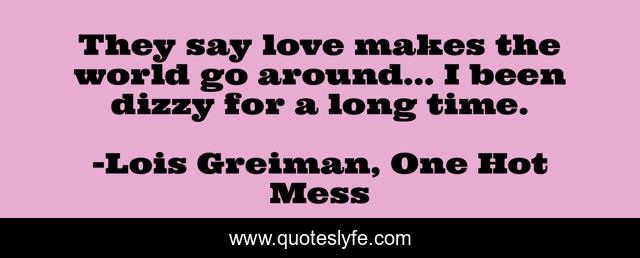 This page presents the quote "They say love makes the world go around… I been dizzy for a long time.". Author of this quote is Lois Greiman, One Hot Mess. This quote is about mystery, chick-lit, humor,.