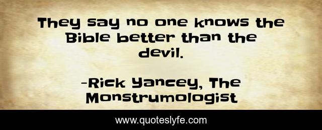 This page presents the quote "They say no one knows the Bible better than the devil.". Author of this quote is Rick Yancey, The Monstrumologist. This quote is about devil, jack-kearns, pellinore-warthrop,.