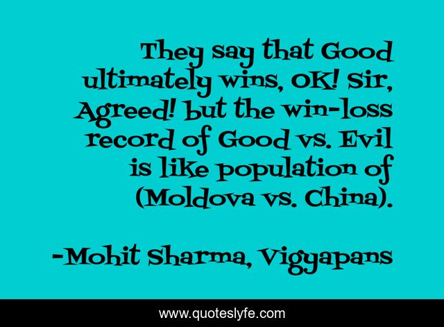 This page presents the quote "They say that Good ultimately wins, OK! Sir, Agreed! but the win-loss record of Good vs. Evil is like population of (Moldova vs. China).". Author of this quote is Mohit Sharma, Vigyapans. This quote is about life, trendster, mohitness, trendy-baba, quotes, mohit,.