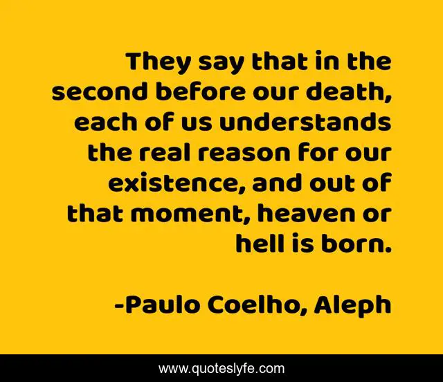 This page presents the quote "They say that in the second before our death, each of us understands the real reason for our existence, and out of that moment, heaven or hell is born.". Author of this quote is Paulo Coelho, Aleph. This quote is about hell, life, death, heaven,.