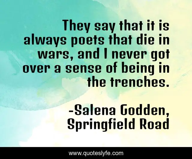 This page presents the quote "They say that it is always poets that die in wars, and I never got over a sense of being in the trenches.". Author of this quote is Salena Godden, Springfield Road. This quote is about salena-godden, poets, spirit, war,.