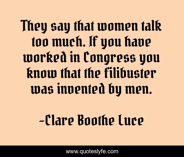 This page presents the quote "They say that women talk too much. If you have worked in Congress you know that the filibuster was invented by men.". Author of this quote is Clare Boothe Luce. .