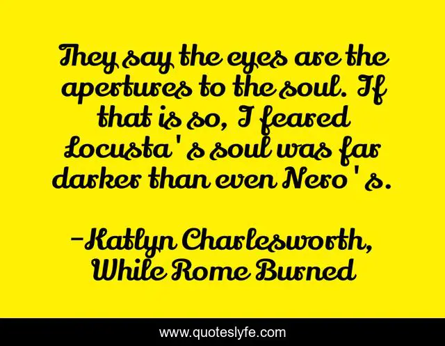 This page presents the quote "They say the eyes are the apertures to the soul. If that is so, I feared Locusta's soul was far darker than even Nero's.". Author of this quote is Katlyn Charlesworth, While Rome Burned. This quote is about ancient-rome, emperor, eyes, nero, soul,.