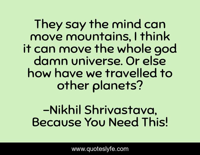 This page presents the quote "They say the mind can move mountains, I think it can move the whole god damn universe. Or else how have we travelled to other planets?". Author of this quote is Nikhil Shrivastava, Because You Need This!. This quote is about mind-power, mind, motivation,.
